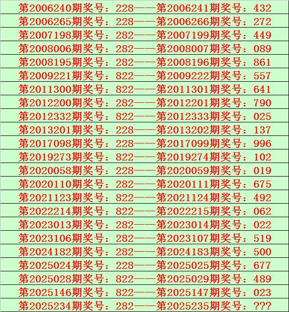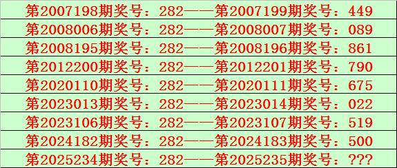 摆设三第2025234期开出奖号282,该号码直选类型历史上出现了9次,前8次开出之后期下期奖号为:449、089、861、790、675、022、519、500,见下表: