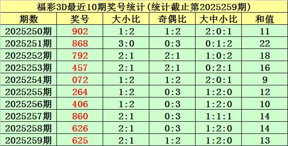 开奖回归:福彩3D第2025259期奖号为:625。奖号类型为组六,和值为13,奇偶比为1:2,跨度为4,012路比为1:0:2,大小比为2:1。