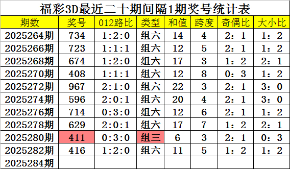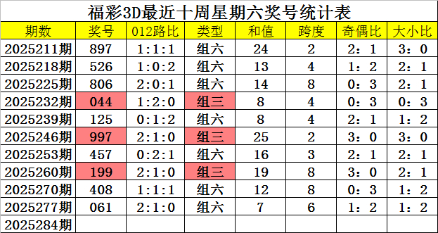 奖号类型分析:从近期周六开奖数据分析,组六近期热出,十周内出现7次,上周六为组六号码,组三出现3次,弘扬相对较冷,本周六展望不时开出组六号码。 奇偶、大小分析:最近5周周六号码奇偶比为9:6,偶数号码走势较冷,上周六出现了2个偶数号码,本期展望偶数号码走热;号码大小比为9:6,小 号相对较冷,本期展望小 号热出。 和尾分析:最近10周周六和尾为:4、3、4、8、8、5、6、9、2、7,波动了7个点位,和尾奇偶比为4:6,基本抓平,和尾大小比为6:4,基本绝顶,本期参考和尾1。 跨度分析:最近周六跨度出现界限在2-8区间,跨度比拟聚会,上周六跨度为6,跨度下落2个点位,本期展望跨度下落,参考跨度3。