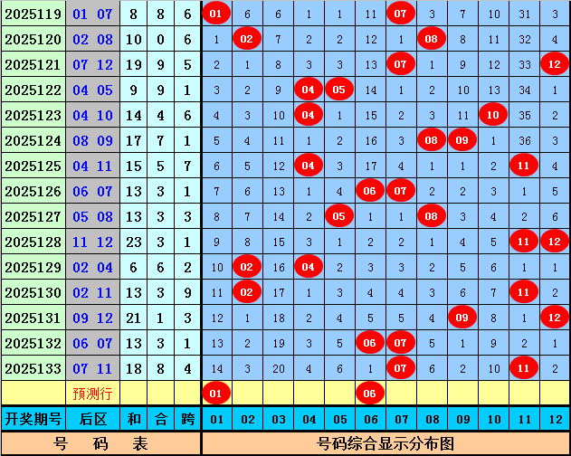 后分辨析(一区01-04,二区05-08,三区09-12):上期后区开出奖号07和11,最近10期后区三区落号比为4:11:8,本期后区眷注号码01、05、06、09、12,后区两码参考01、06。