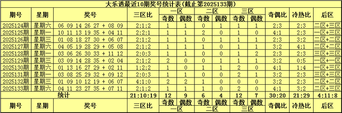 袁启晨第2025134期大乐透分析: 前区冷热走势(遗漏值0-4为冷码,遗漏值4以上为冷码):上期冷码出现3个:04、11、23,前区冷热比为3:2,最近10期冷热比为21:29,热码走势活跃,本期小心热码络续活跃补,冷热比参考1:4。 前区奇偶分析:上期前区奇偶比为4:1,奇数号码较热,"最近10期奇偶比4:1出现了3次,其奇偶奖号总比例为30:20,奇数号码进展活跃,本期瞻望奇数号码络续走热,看酷好偶比3:2。 前区三区走势:上期前区奖号三区比为2:1:2,最近10期前区奖号三区比为21:10:19。 前一区(01-12):最近10期出号21个,进展相比活跃,前区奇偶比为12:9,奇数号码相对活跃,上期前一区走温开出2个奖号,奇偶号码分别开出1个,本期瞻望前一区号码络续温冷,看好偶数号码热出,保举号码10。 前二区(13-23):最近10期出号10个,出号相对较少,前区奇偶比为6:4,奇数号码相对活跃,上期前二区较冷出现1个奖号,为奇数号码,本期看好前二区号码回补转热,瞻望奇偶号码同期开出,眷注号码16、21、23。 前三区(24-35):最近10期出号19个,进展相比活跃,前区奇偶比为12:7,奇数号码相对活跃,上期前三区走温开出2个奖号,全为奇数号码,本期瞻望前三区号码络续温冷,小心奇偶号码同期开出,眷注号码25。 要而言之,大乐透第2025134期前区三区比看好1:3:1。