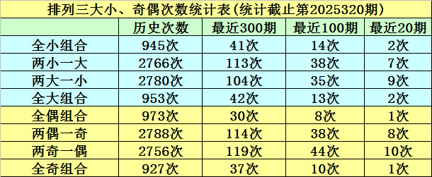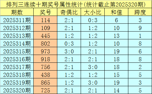 上期回来:陈设三第2025320期奖号:725。类型:组六,奇偶式样:奇偶奇,大小式样:大小大,和值:14,跨度:5。