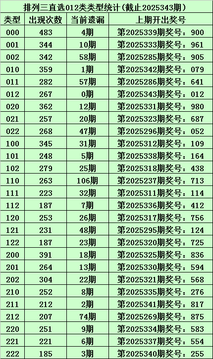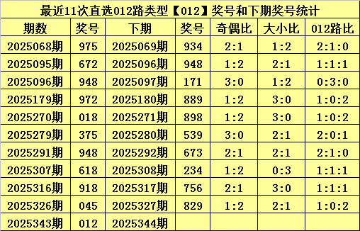 摆设三上期开出奖号为:012,其直选012路类型为012,历史上直选012号码已开出了267次,最近11期离别开出奖号为:975、672、948、972、018、375、948、618、918、045、012。