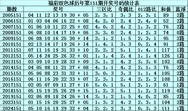 在第151期历史同时奖号中,红球三区散布总比例为44:29:29,奇偶总比例为53:49,012路比为27:38:37,和值散布在52-126之间,蓝球号码012路总比例为3:5:9。