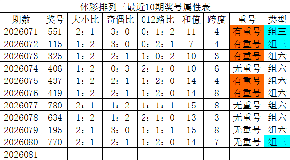体彩摆设三最近10期辞别开出奖号:551、115、325、406、437、419、780、634、195、770,各奖号属性详见下表:
