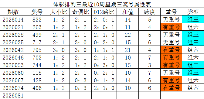 体彩摆设三最近10周星期三奖号辞别为:833、263、499、717、795、703、744、118、428、406,各奖号属性详见下表: